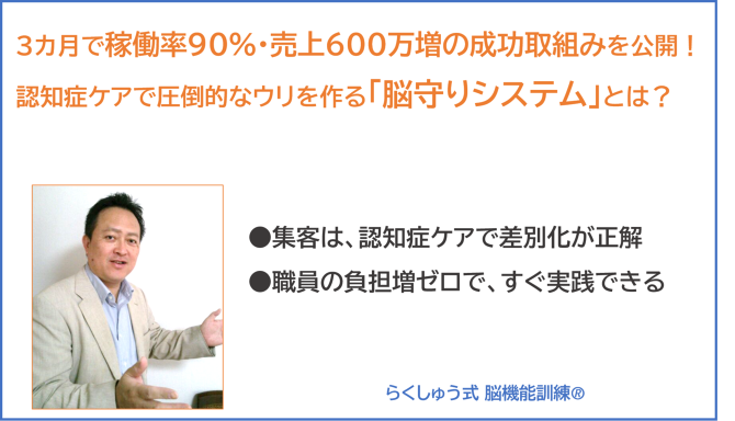 本セミナーでは、単なるレクではない、認知症ケアで圧倒的に選ばれる理由を作る「3ステップ・脳守りシステム」戦略を公開します。
