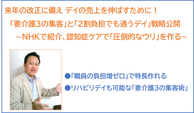 本セミナーでは、来年の改正に備え売上を伸ばすために、認知症ケアで圧倒的なウリを作る「3ステップ・脳守りシステム」戦略を公開。