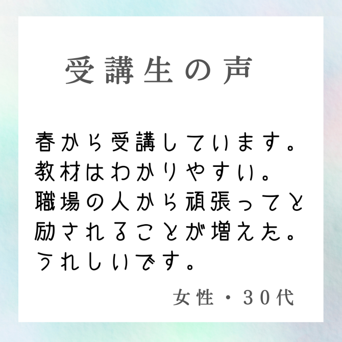 Lineやメールを活用し、受講生からの質問なども随時受付・サポートしていますのでご安心ください。 ご自身の就業ペースに合わせて焦らずに実践してください。 職場の仲間の応援や利用者さんからの感謝の声もモチベーション維持につながります。 |